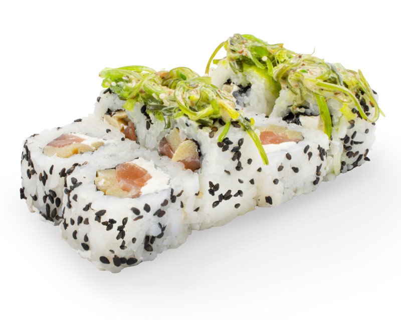 8 шт. Рис, сыр творожный, омлет томаго, салат чука, соус кунжутный, лист нори. В комплекте: соевый соус - 1, васаби -1, имбирь - 1