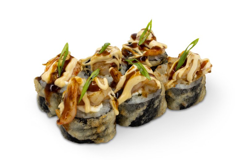 8 шт. Рис, креветки, омлет томаго, огурец свежий, кляр темпура, соус сливочный, сыр творожный, лист нори В комплекте: соевый соус - 1, васаби -1, имбирь - 1