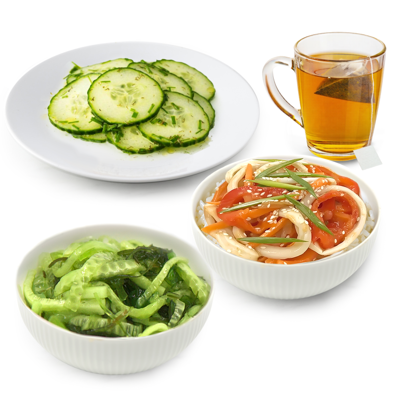 Обжаренный кальмар с соусом том ям, суши рис, свежий огурец, салат чука, насыщенный кунжутный соус, зеленый лук, морковка, болгарский перец, лук репчатый, маринованный кабачок, имбирно-чесночный микс, белый кунжут, долька свежего лайма В комплекте: Чай черный Highgrown Bouquet *на фото демонстрационный вариант подачи