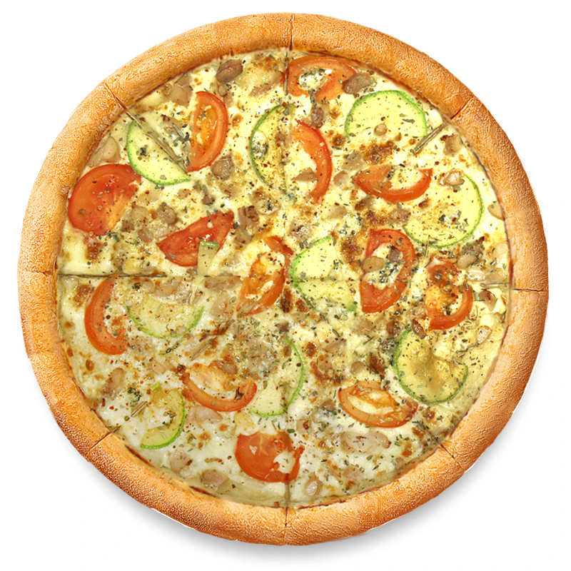 Сочное куриное бедрышко, маринованный кабачок, свежие помидоры, белый соус, нежный сыр моцарелла, сыр с голубой плесенью, орегано, традиционное тесто для пиццы *на фото демонстрационный вариант подачи