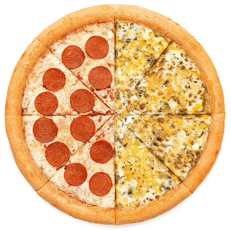 Пепперони: Пикантная пепперони, нежный сыр моцарелла, красный соус, традиционное тесто для пиццы Четыре сыра: Ассорти из нежный сыров: моцарелла, чеддер, пармезан, сыр с голубой плесенью; белый соус, традиционное тесто для пиццы *на фото демонстрационный вариант подачи