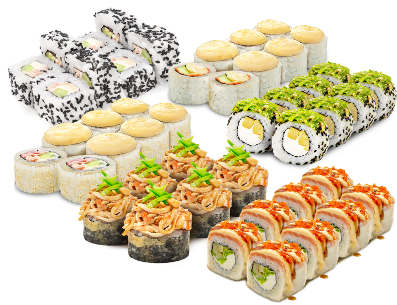 46 шт. Вован-де-Мрот, Константин, Чука-буст, Золото темпуры, Хипстер лосось Нанкин. В комплекте: соевый соус - 4, васаби - 4, имбирь - 4