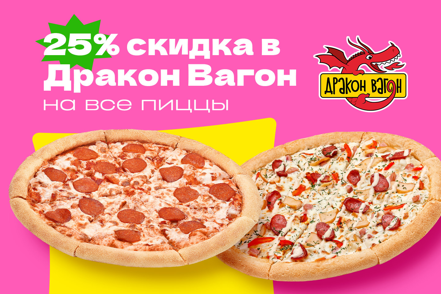 Закажите прямо сейчас любые пиццы на сумму от 1600₽ и получите скидку 25% на весь ваш заказ. Делайте заказ на сайте drakonvagon.ru или в приложении на сумму от 1600 рублей до 31 декабря 2024 года. Акция действует по промокоду: YAND25. Вводите промокод в корзине — получайте экономию.
