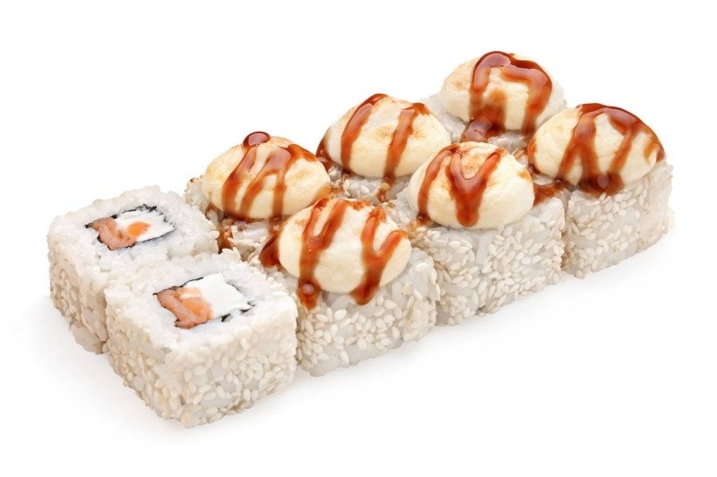Рис, соус белый сырный, лосось, сыр творожный, соус унаги, кунжут светлый, нори В комплекте: 1 соевый соус, 1 имбирь, 1 васаби